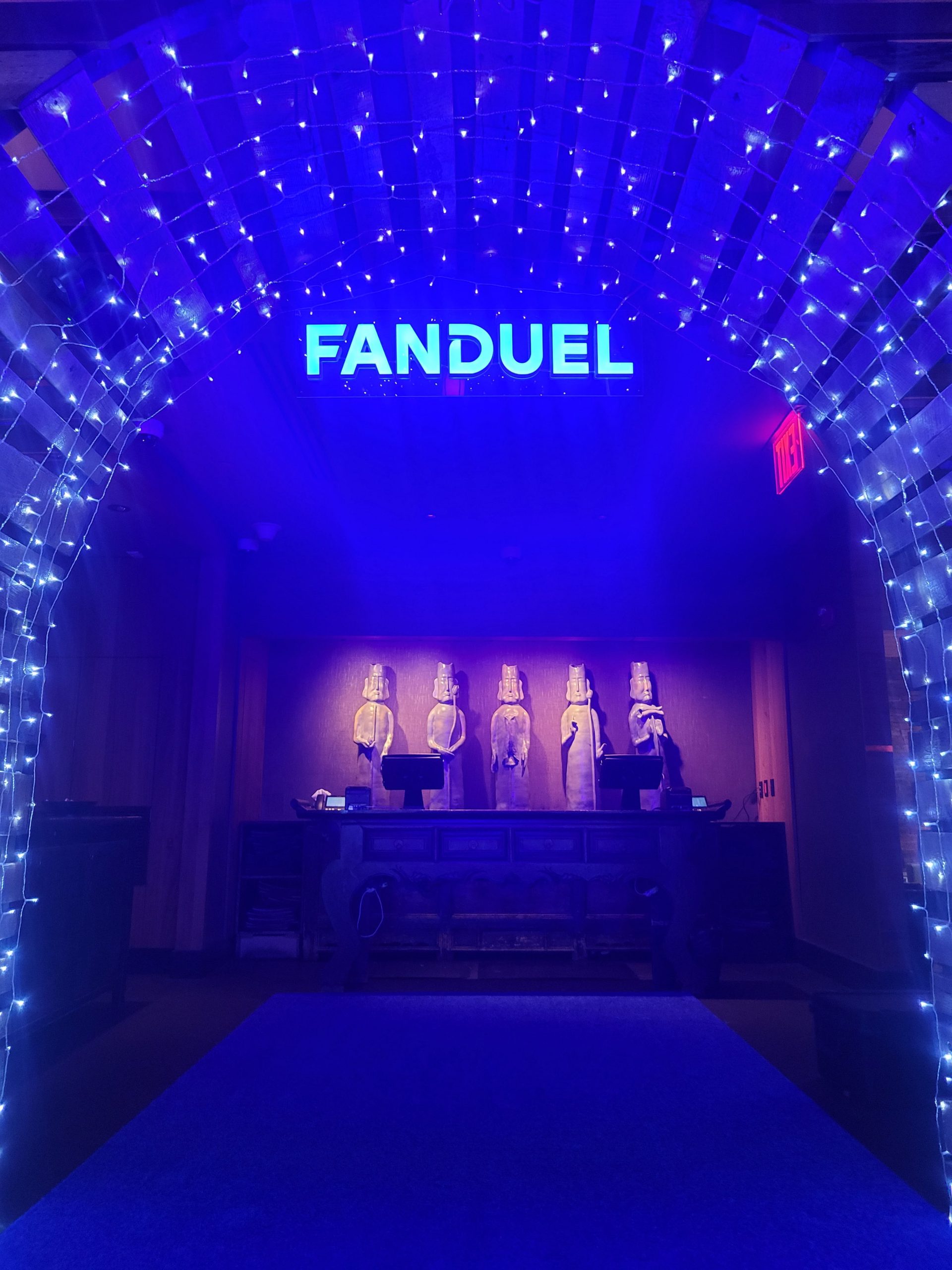 Fanduel NYC Office Holiday Party with a remarkable attendance of over 600 guests took place at the prestigious Tao Downtown Restaurant and Night Club. The extensive list of services provided by NYC Photo Party included a stunning 160-foot long custom blue Event Carpet Runner Production for the entrance hallway, as well as two large Step and Repeat Productions. Additionally, the NYC Photo Party Team offered professional event uplighting with 50 Wireless Uplights, accentuating the entire event space with the signature Fanduel blue color. To highlight the occasion and further enhance the ambiance, Custom-Made Fanduel Neon Light Installations were also featured.