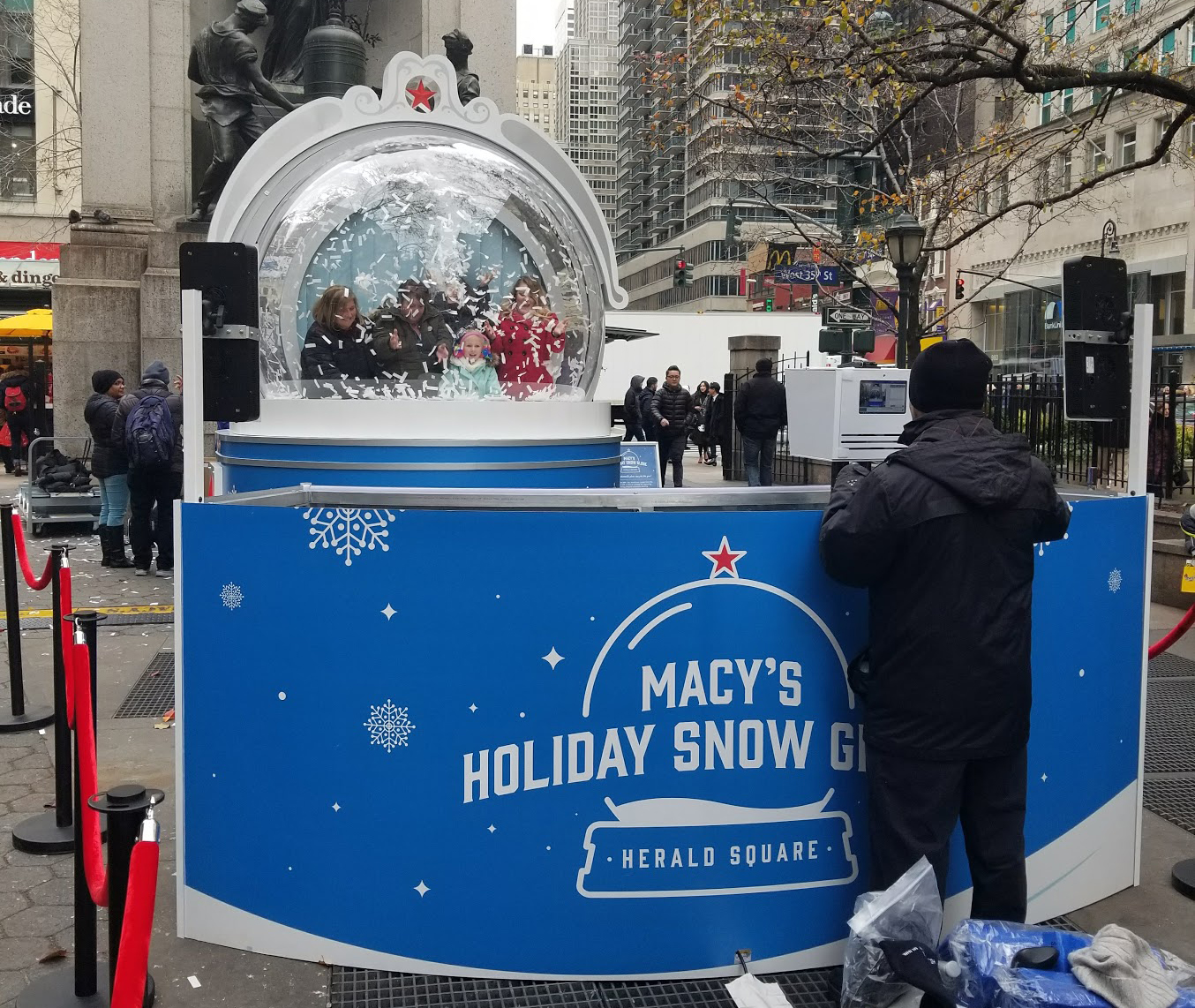 Everyone know that Macy's does it BIG for the Holidays... And BIG was the request they had for NYC Photo Party when they reached out to us with the idea of placing a giant snow globe video booth experience outside of their Flagship Herald Square Store in NYC! In addition, the team at Macy's wanted the shareable output videos to have a "panning" effect (moving side-to-side), while also capturing full motion of guests having fun inside the snow globe! Not an easy task, but our team was eager to get to the drawing board and come up with a solution... OR a "panning plan" if you will 😉
