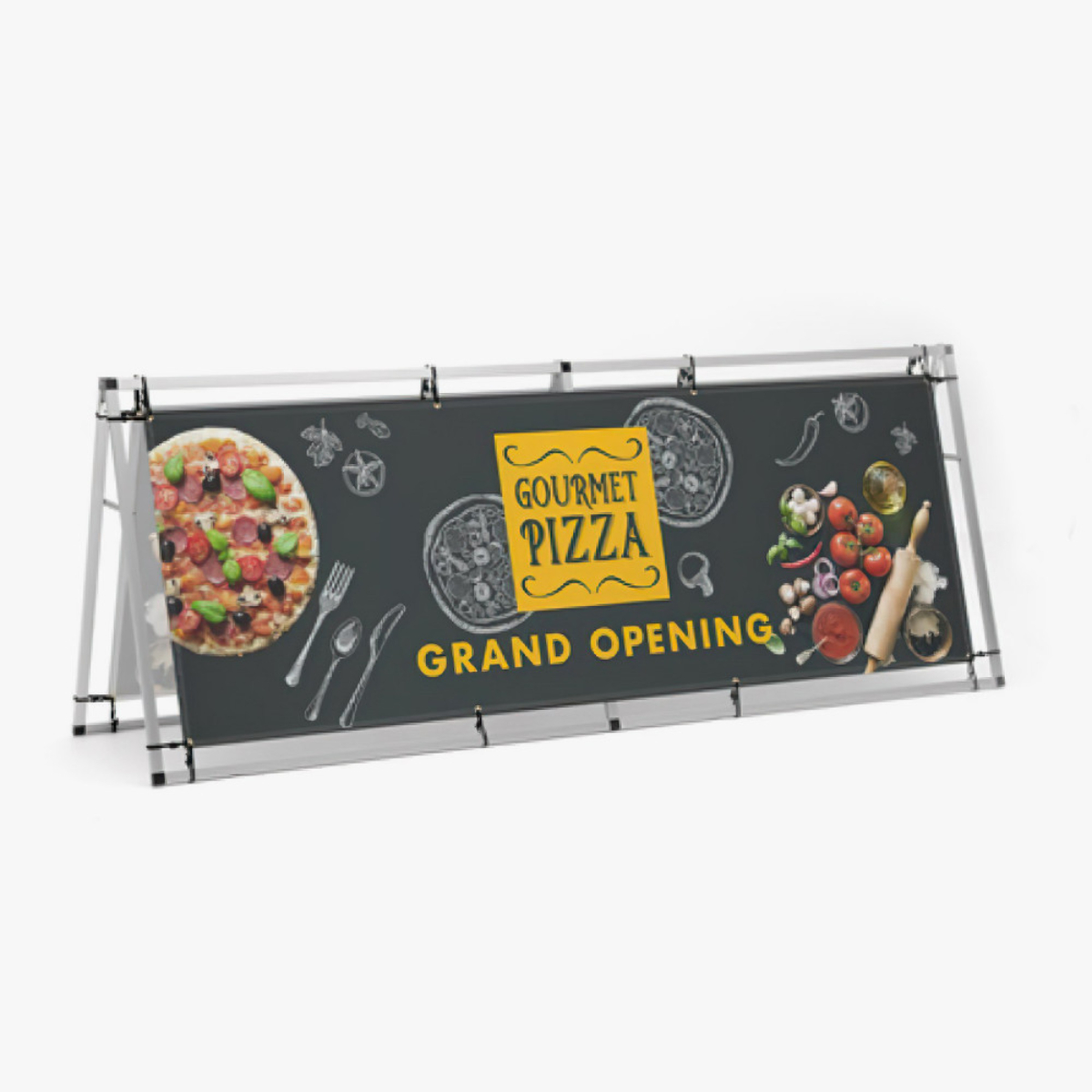 Ideal for outdoor events, the A-Frame Banner Display is a durable and effective advertising tool. Can be displayed with a single front graphic or graphics front and back for double the impact. The sturdy aluminum bars easily connect for quick assembly and the grommeted banners are attached via hooked bungee cords.