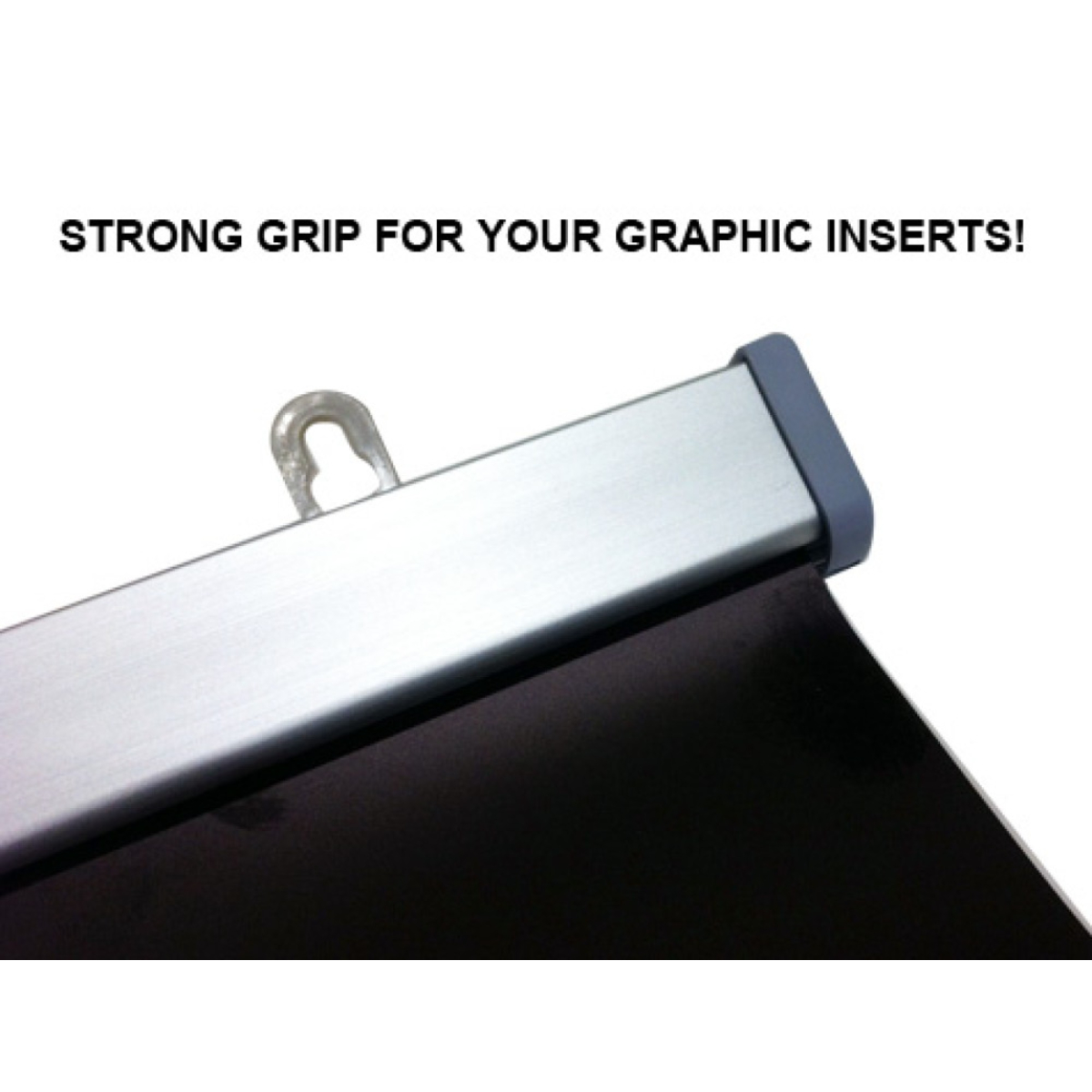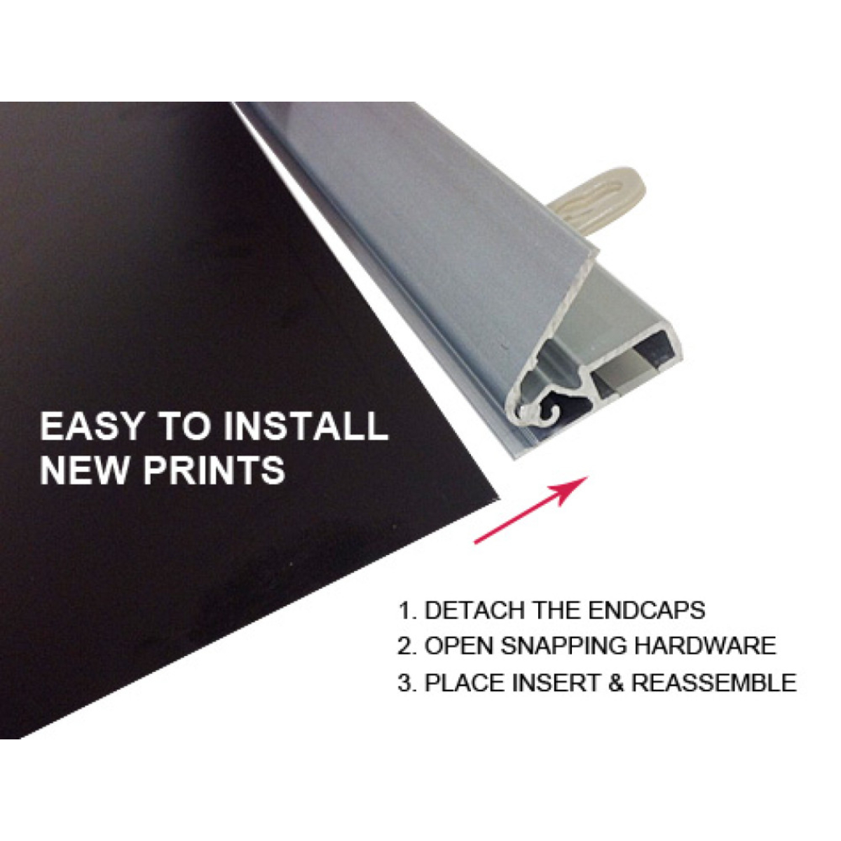 Our Snap Poster Hanger System is made of the finest aluminum. With our 3 step easy install, you can install or change graphics within seconds. Simply open, insert, and snap close. Thanks to this unique design, our Snap Poster Hanger will hold your graphic with amazing strength with no scoring, pockets, or any special graphic treatment. This easy-to-use hardware system comes with 4 ready to hang hooks and can be used in any indoor location.